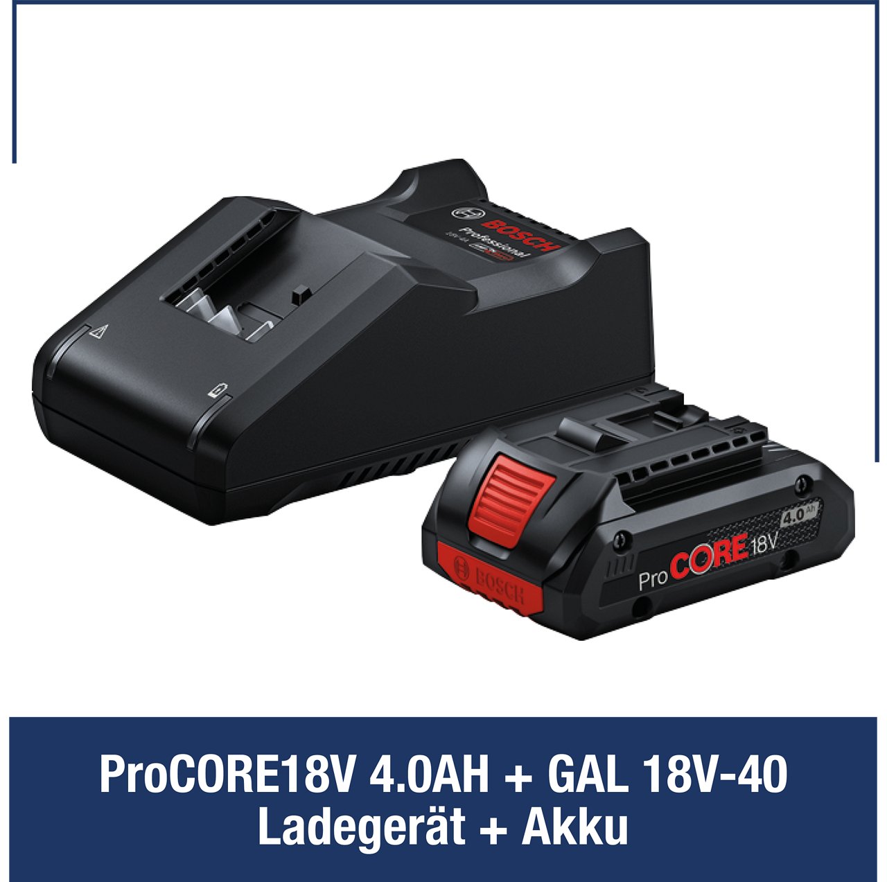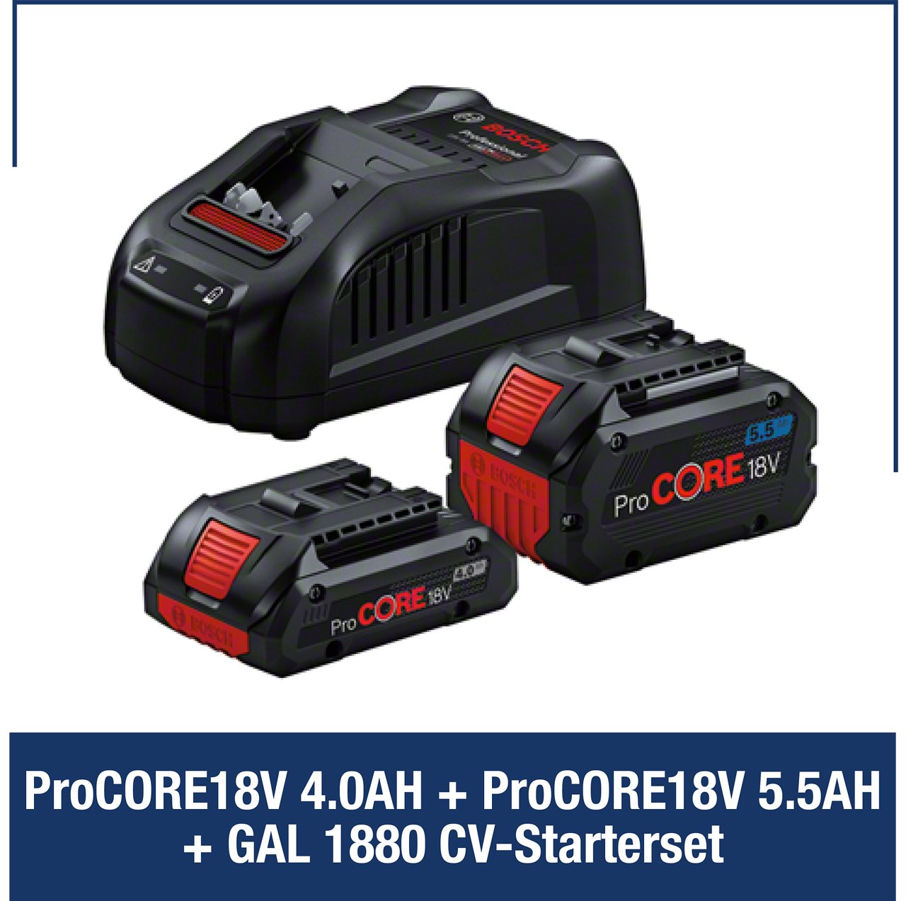 Kaufe Bosch Professional 18V Elektrowerkzeuge, Gartengeräte, Messgeräte, Akkus und Ladegeräte im Wert von über 499 € (Rechnungsbetrag ohne MwSt.) und erhalte ein ProCORE18V 4.0Ah + ProCORE18V 5.5Ah + GAL 1880 CV-Starterset kostenlos dazu.